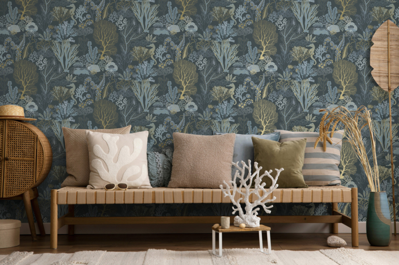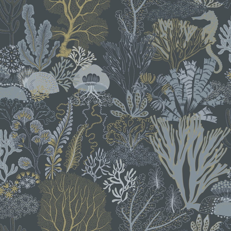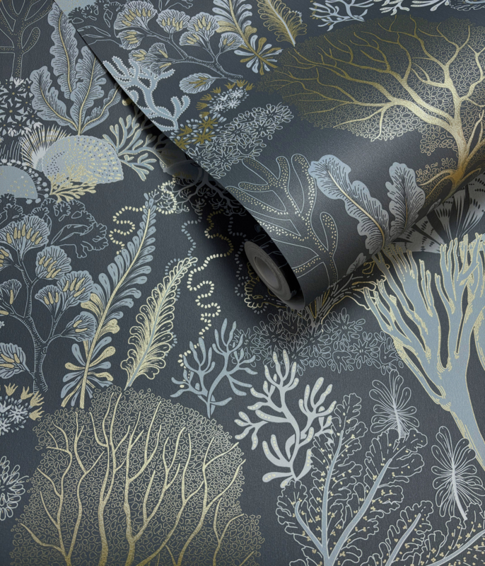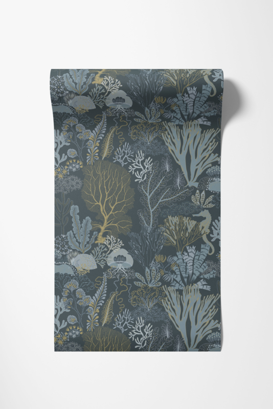 Nautilus Navy Gold 92081 uit de Wanderlust-collectie van Dutch First Class is de keuze voor wie de stille diepte van de oceaan naar binnen haalt, omgeven door goud en schemerlicht. Het dessin toont een weelderig onderwaterlandschap van wiegende kelpbossen, vertakte koralen en zeegras in grijsblauwe tinten op een diepe, donkere achtergrond. Doorstipt met goudkleurige metallic accenten: glanzende koraalsilhouetten en vertakte zeeplanten die het licht vangen als zonnestralen door zeewater. Een zeepaardje verschijnt verstopt tussen het zeewier. De Metallic Shine-afwerking laat het goud oplichten afhankelijk van de lichtinval. Nautilus Navy Gold transformeert een wand in een modern onderzees geheel, opulent en sereen tegelijk.