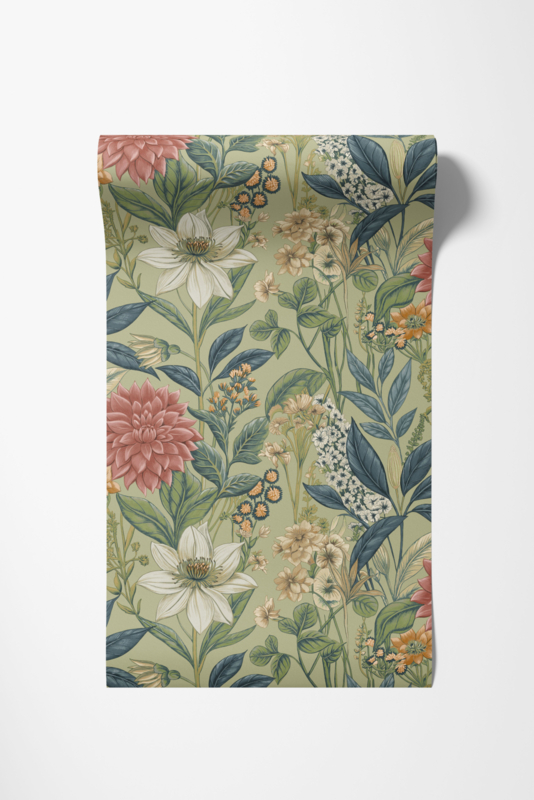 Dit dessin is bij uitstek geschikt als statement-accentwand in de woonkamer, slaapkamer of eetkamer. De zachte saliegroen achtergrond en het weelderige bloemenpatroon creëren een frisse, organische sfeer.