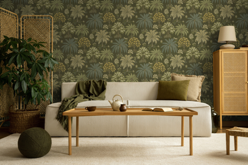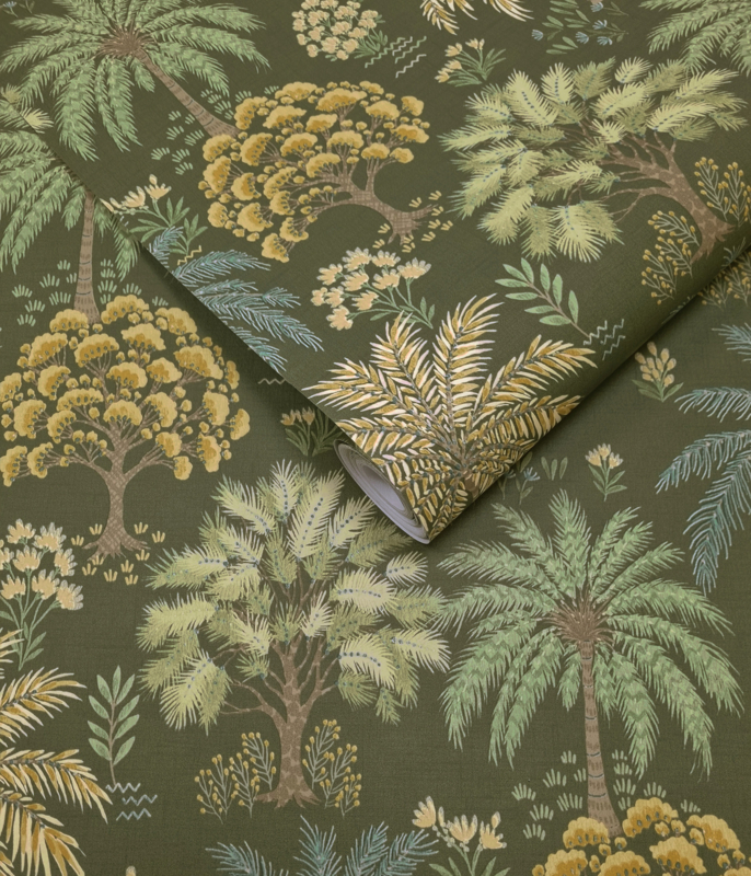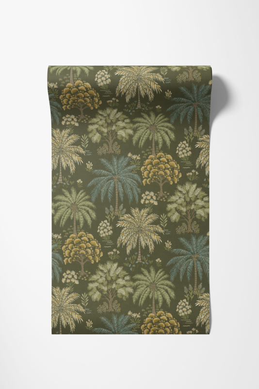 Solana Green 92032 uit de Wanderlust-collectie van Dutch First Class is de keuze voor wie de weelde van de tropen op een dramatische, donkere achtergrond wil vangen. Het dessin toont een weids tropisch bos van wuivende palmen, bloeiende bomen en gelaagd gebladerte in groen, oker en blauwgroen op een diepe, donkere olijfgroene achtergrond met een subtiele linnentextuur. De illustratieve stijl heeft iets van een handgetekende botanische tekening, verfijnd en vol leven tegelijk. De donkere achtergrond geeft het dessin maximale diepte en laat de lichtere groene en oker tinten optimaal uitkomen. Solana Green transformeert een wand in een sereen tropisch landschap dat rust uitstraalt en de verbeelding prikkelt.