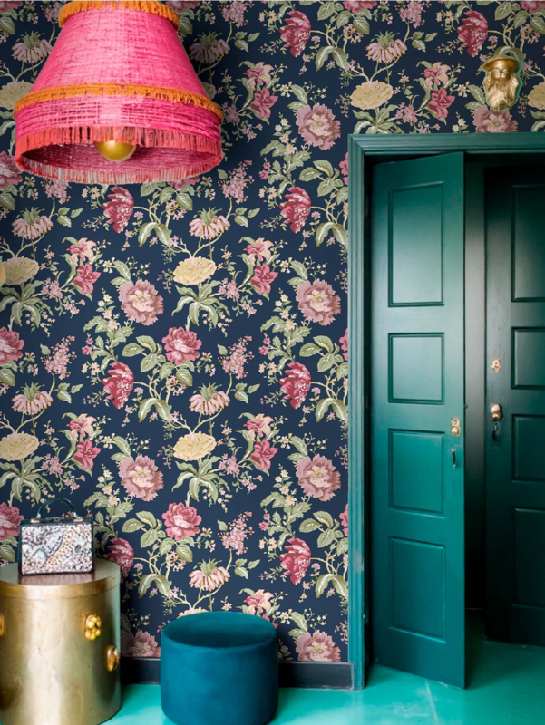 Ninfa 8303 uit de Blooming Garden-collectie van Noordwand is de keuze voor wie romantische bloemenweelde op de muur wil. Het dessin toont grote, weelderige bloemen in oudroze, beige en lila op een diepe, vergrijsd blauwe achtergrond. Rozen, pioenrozen, lelies en seringen wisselen elkaar af tussen groene bladeren en sierlijke rankende stengels. De geschilderde stijl is expressief en klassiek tegelijk, met de warmte van een traditioneel Engels tuindessin in een moderne, dramatische kleurencombinatie. Ninfa transformeert een wand in een romantisch bloemenveld, weelderig en tijdloos.