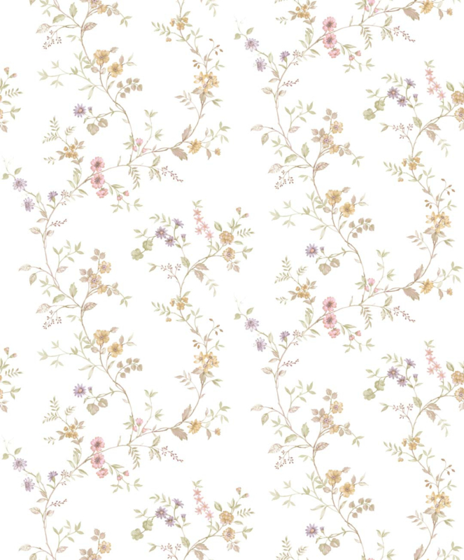 - Sierlijk slingerend bloemenpatroon met kleine bloempjes in roze, okergeel en lila