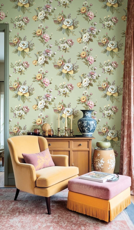Dit dessin is bij uitstek geschikt als accentwand of rondom in woonkamer, slaapkamer of eetkamer. De saliegroen achtergrond en de weelderige bloemboeketten creëren een warme, klassieke sfeer met allure.