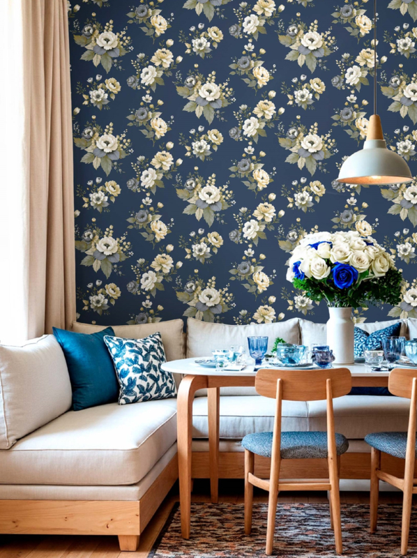 Dit dessin is bij uitstek geschikt als accentwand in woonkamer, eetkamer of slaapkamer. De diepe navy achtergrond en de weelderige lichte bloemboeketten creëren een dramatische, elegante sfeer met allure.