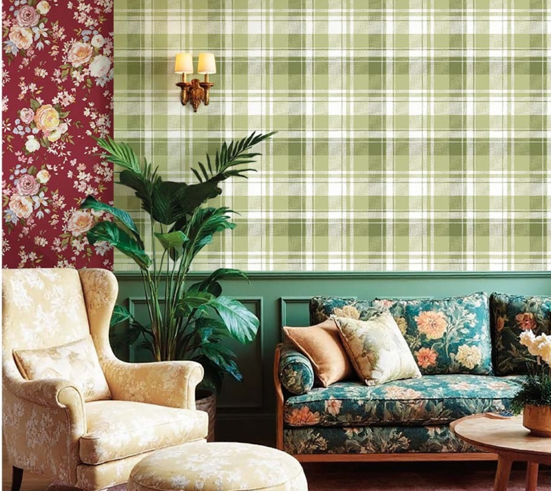 Tartan 8388 uit de Blooming Garden-collectie van Noordwand is de keuze voor wie een klassiek tartan-ruitpatroon wil met een frisse, naturale uitstraling. Het dessin toont een grootschalig geruit tartan patroon in olijfgroen, zachtgroen en wit, met een subtiele geweven textuur die het patroon diepte en een stoffen kwaliteit geeft. De afwisseling van lichte en donkere groentinten naast de witte vlakken maakt het dessin levendig zonder druk te worden. Tartan 8388 combineert landelijke charme met moderne frisheid. Zoals de sfeerimpressie laat zien, werkt dit dessin uitstekend als sterke basiswand naast een drukker bloemendessin.