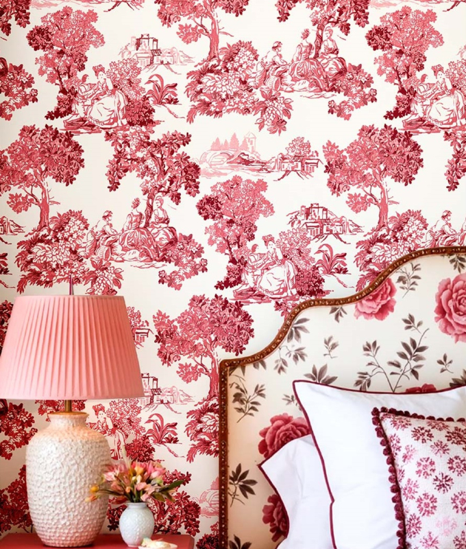 Dit dessin is bij uitstek geschikt als accentwand in slaapkamer, woonkamer of eetkamer. De roze en bordeauxrode toile-taferelen op de witte achtergrond creëren een romantische, elegante sfeer met Franse allure.