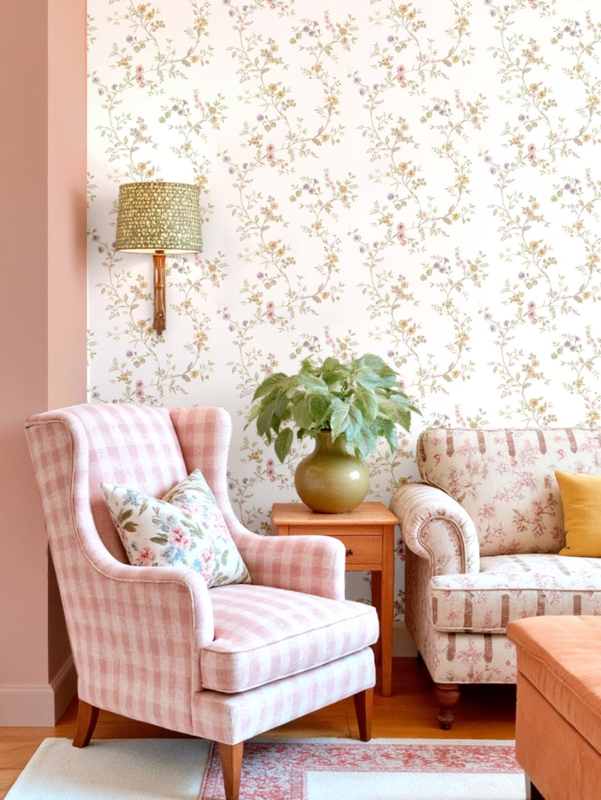 Dit dessin is veelzijdig inzetbaar in woonkamer, slaapkamer of eetkamer. De crème achtergrond en de zachte bloemenaccenten in roze en beige creëren een romantische, lichte sfeer in elke ruimte.