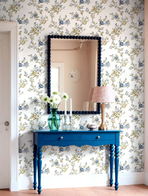Dit dessin is veelzijdig inzetbaar in woonkamer, slaapkamer of hal. De witte achtergrond en de frisse blauwe bloemenaccenten creëren een lichte, uitnodigende sfeer in elke ruimte.