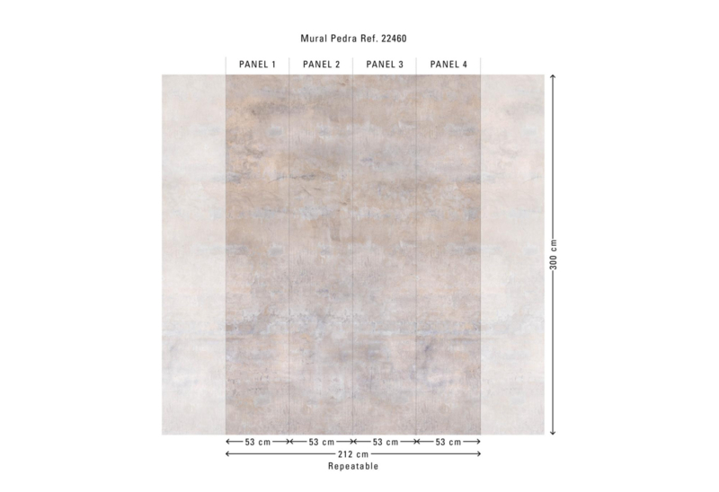 Het panorama bestaat uit 4 banen van elk 53 cm breed, samen 212 cm breed bij 300 cm hoog. De tekening sluit perfect aan, zodat je meerdere exemplaren naast elkaar kunt plaatsen voor een naadloos, doorlopend effect.
