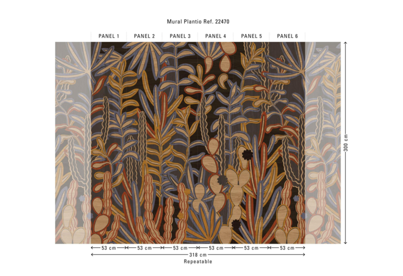 Dit panorama meet 318 cm breed (6 banen van 53 cm) bij 300 cm hoog. De tekening sluit perfect aan, zodat je meerdere exemplaren naast elkaar kunt plaatsen voor een doorlopend, grootschalig effect.