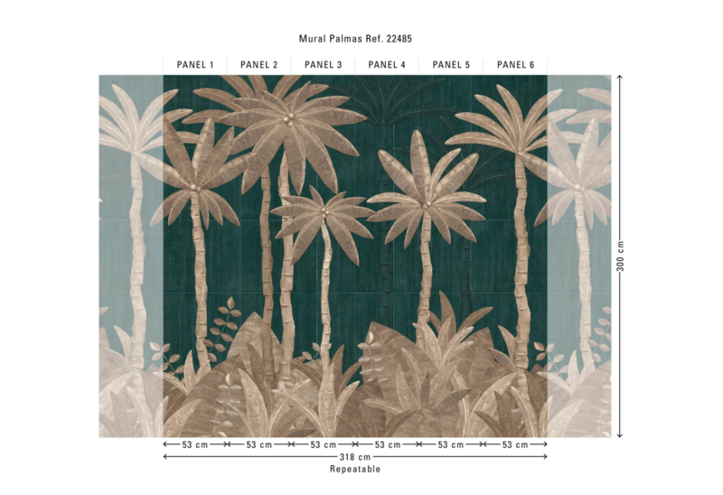 - Grootschalige tropische panoramamural met gestileerde palmbomen in zandbeige en goud op petrolgroen
