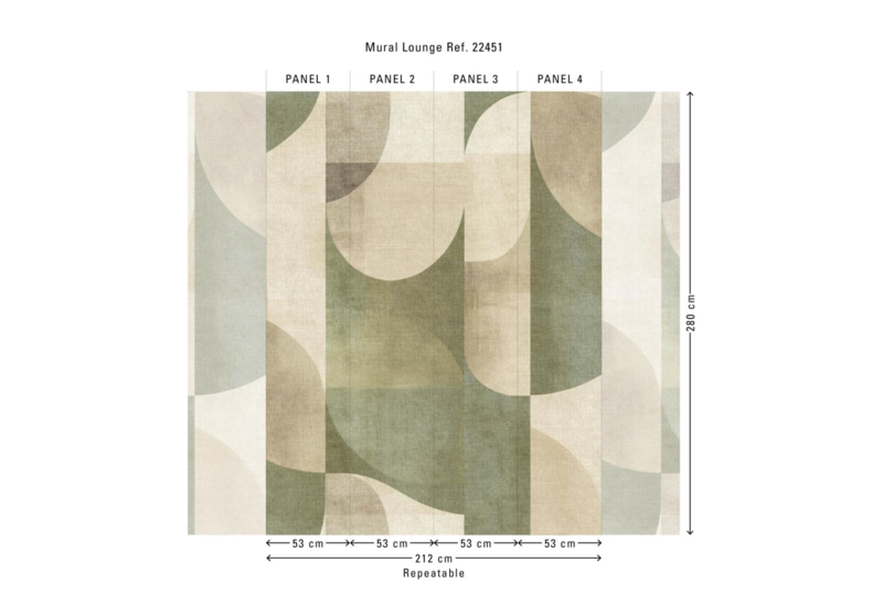 - Grootschalige panoramamural met overlappende cirkels en bogen in gedempte groentinten, beige en lichtgrijs
