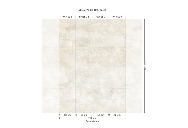 Het panorama bestaat uit 4 banen van elk 53 cm breed, samen 212 cm breed bij 300 cm hoog. De tekening sluit perfect aan, zodat je meerdere exemplaren naast elkaar kunt plaatsen voor een naadloos, doorlopend effect.