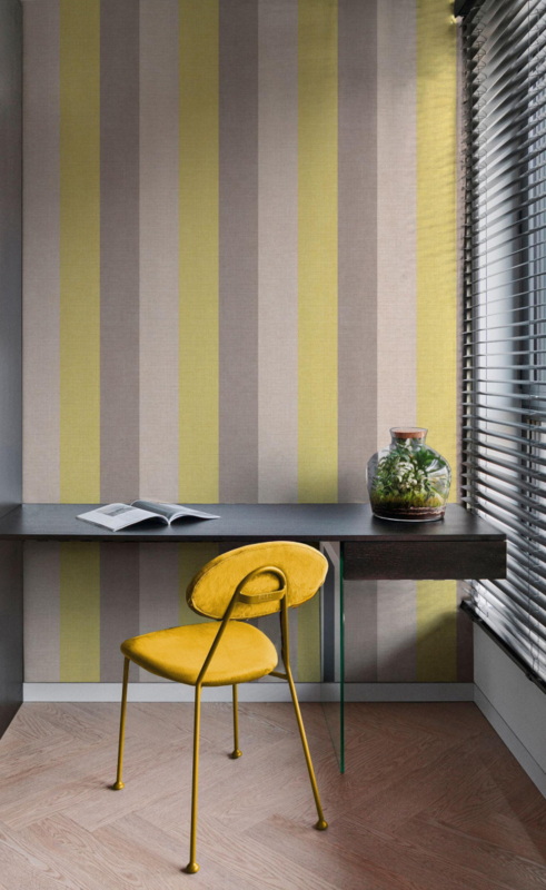 De driekleurige compositie en linnentextuur van Strixxi komen op een foto niet volledig tot hun recht. Bezoek onze winkel regio Rotterdam en ervaar zelf hoe het fris geel, warmgrijs en lichtbeige een wand direct leven en evenwicht geven. Onze specialisten adviseren je persoonlijk, van dessinkeuze tot plaatsing. Gratis staalservice beschikbaar.