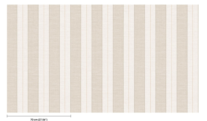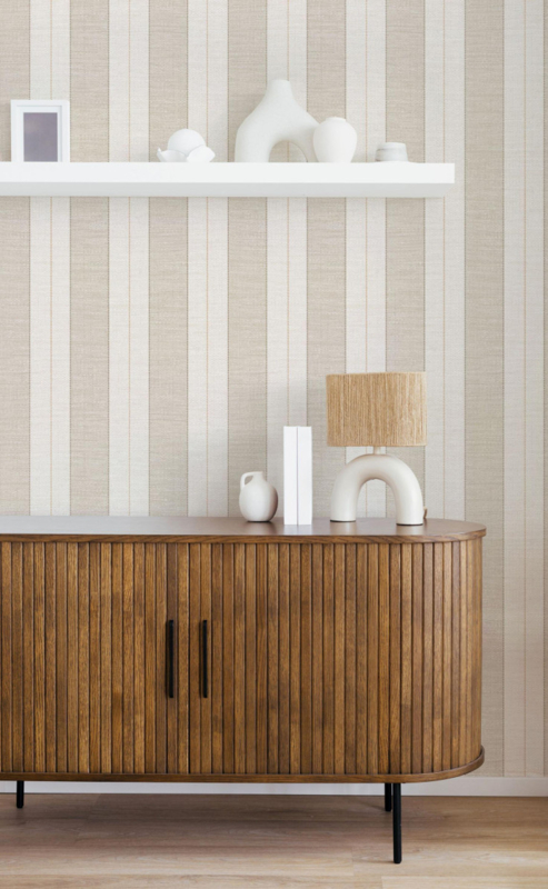 Serena 90781 uit de Stripes & Stripes-collectie van Hookedonwalls combineert de klassieke streep met de warmte van textiel in een licht, ingetogen palet. Brede verticale banen in twee beige tinten wisselen elkaar af op een ondergrond met uitgesproken linnentextuur. Langs de randen van elke baan loopt een fijne gestippelde naadlijn die het dessin een subtiel textielmotief geeft. Serena is streepbehang met warmte en verfijning, voor wie een lichte wand wil die toch iets te zeggen heeft.