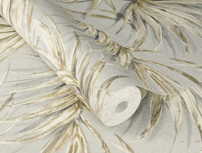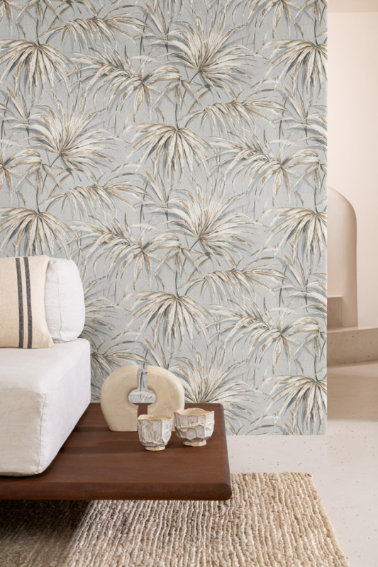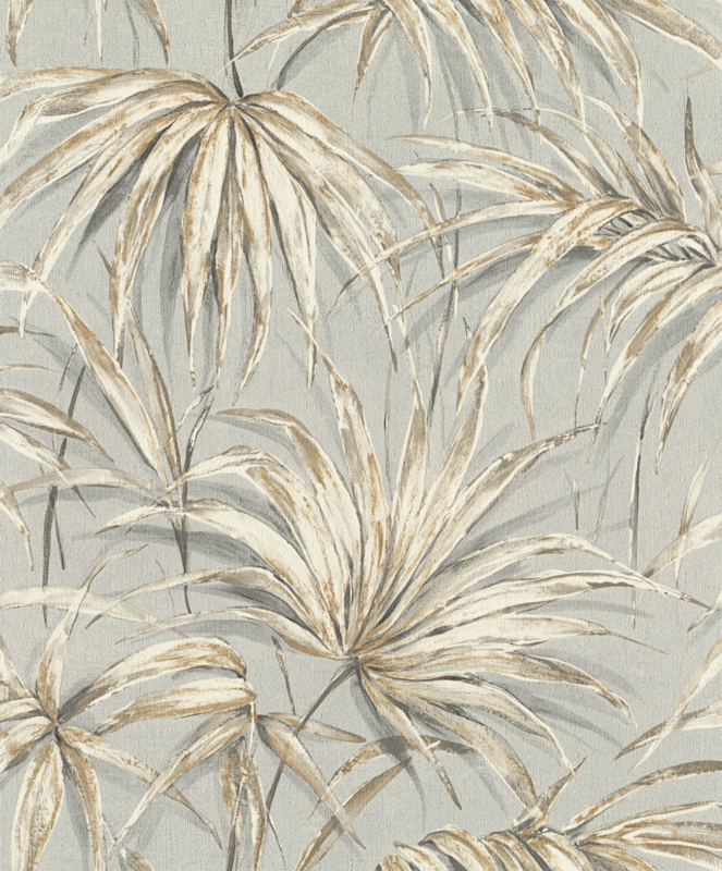 435368 uit de Noble Zen-collectie van Rasch is behang met de kracht van natuur en de rust van Japans design. Grootschalige palmbladen in beige, crème en gouden tinten tekenen zich af op een zilvergrijze ondergrond. Geschilderd van karakter, kalm van uitstraling. Dit is behang dat een wand transformeert zonder te overheersen.