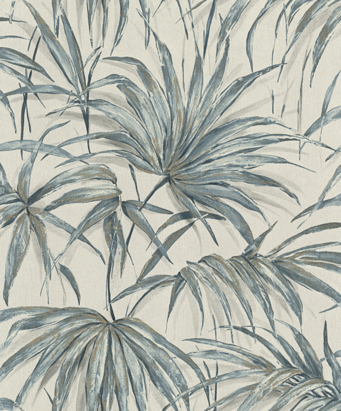435337 uit de Noble Zen-collectie van Rasch is grootschalig palmblad-behang met blauwgrijze palmbladen en gouden accenten op een zachtgrijze ondergrond. Koeler en stiller van toon dan de andere palmblad-varianten uit Noble Zen. Een dessin dat rust uitstraalt en toch aanwezig is.