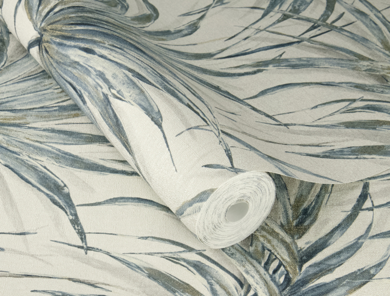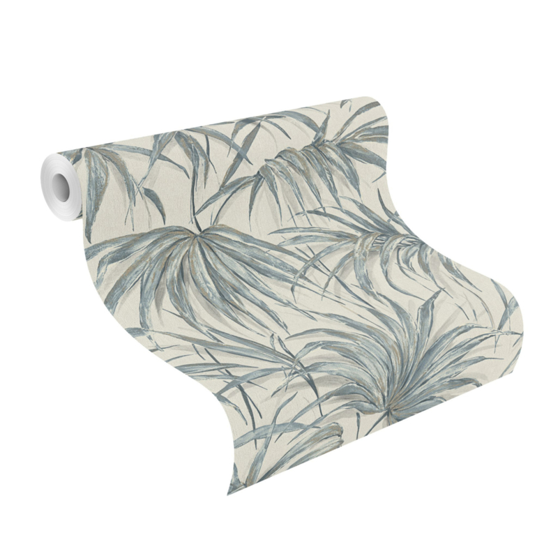 - Grootschalig palmblad-dessin met blauwgrijze palmbladen en gouden accenten op een zachtgrijze ondergrond