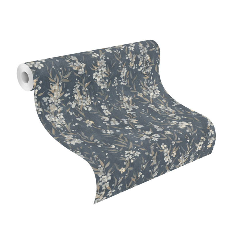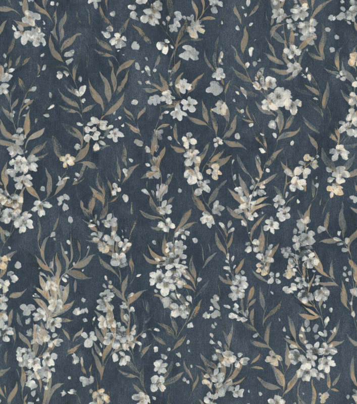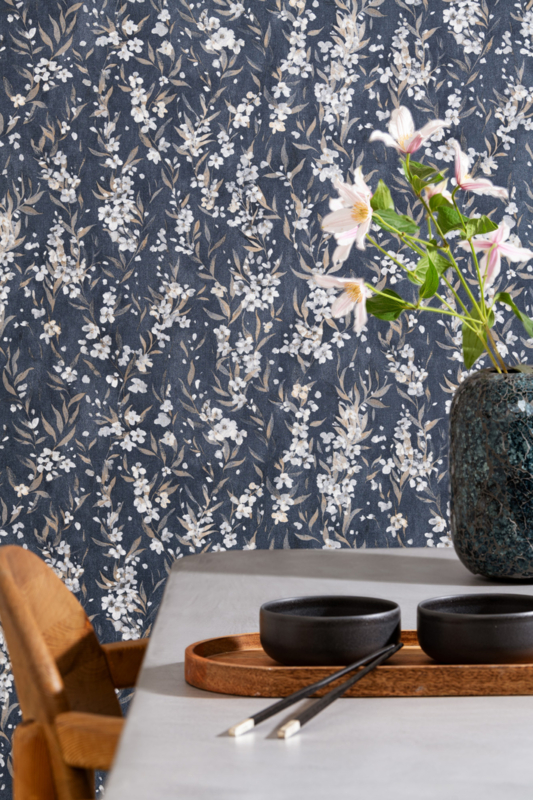 435238 uit de Noble Zen-collectie van Rasch is bloesembehang met witte en crème bloemetjes en bruingrijze bladeren op een diepblauwe ondergrond. Elk detail op zijn plaats, niets te veel. De meest uitgesproken kleurstelling van het bloesemdessin uit Noble Zen.