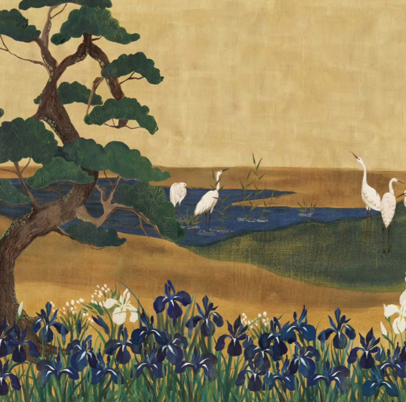 - Japans geïnspireerd landschap met pijnboom, reigers, irissen en een gouden achtergrond