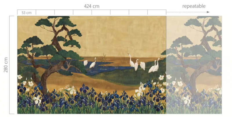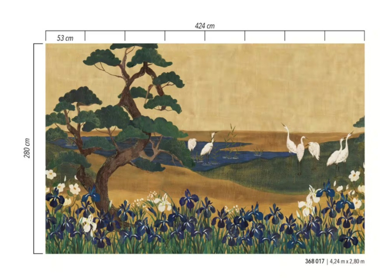 368017 uit de Noble Zen-collectie van Rasch is een fotobehang van 424 x 280 cm met een Japans geïnspireerd landschap. Een sierlijke pijnboom, witte reigers aan een blauw water, diepblauwe irissen op de voorgrond en een warme gouden achtergrond. Geen dessin dat zich herhaalt. Één beeld, één wand, één statement.