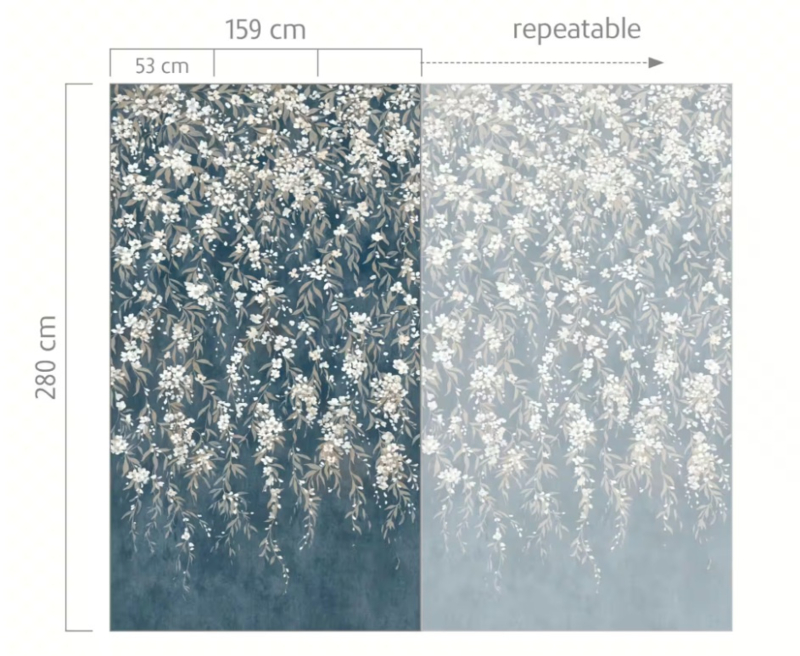 Dit fotobehang is 159 cm breed en 280 cm hoog en bestaat uit 3 banen van elk 53 cm breed. Omdat het dessin herhaalbaar is, kunt u meerdere sets naast elkaar plaatsen voor een doorlopend effect op elke wandbreedte.