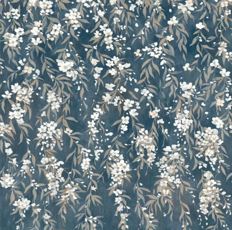 De diepte van het donkerblauw en het spel van licht op de hangende bloesems ervaar je pas als je dit behang in het echt ziet. Bezoek onze winkel regio Rotterdam en ontdek hoe dit dessin een wand transformeert. Onze specialisten adviseren je persoonlijk, van plaatsing tot afwerking.