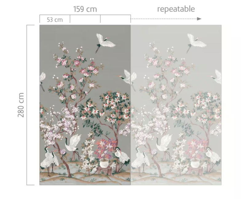 Dit fotobehang is 159 cm breed en 280 cm hoog en bestaat uit 3 banen van elk 53 cm breed. Omdat het dessin herhaalbaar is, kunt u meerdere sets naast elkaar plaatsen voor een doorlopend effect op elke wandbreedte.