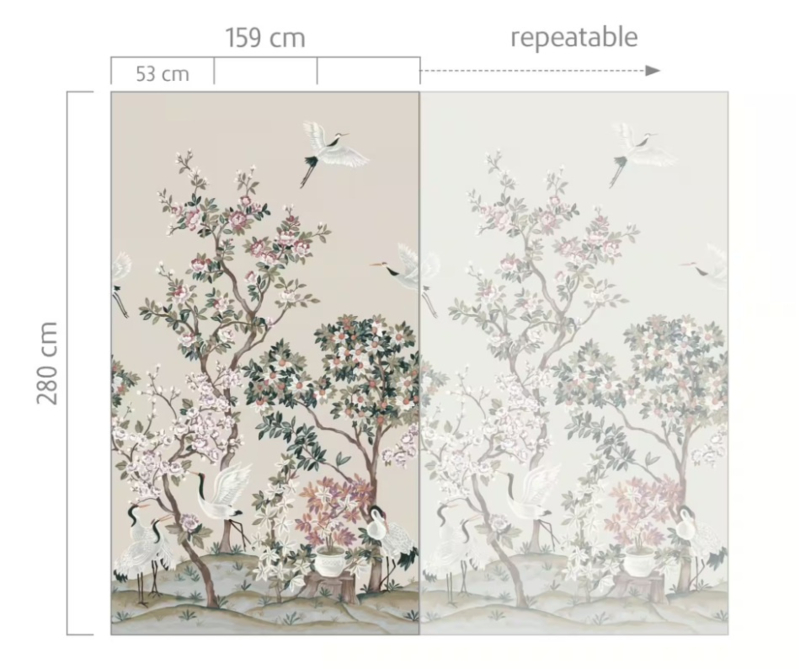Dit fotobehang is 159 cm breed en 280 cm hoog en bestaat uit 3 banen van elk 53 cm breed. Omdat het dessin herhaalbaar is, kunt u meerdere sets naast elkaar plaatsen voor een doorlopend effect op elke wandbreedte.