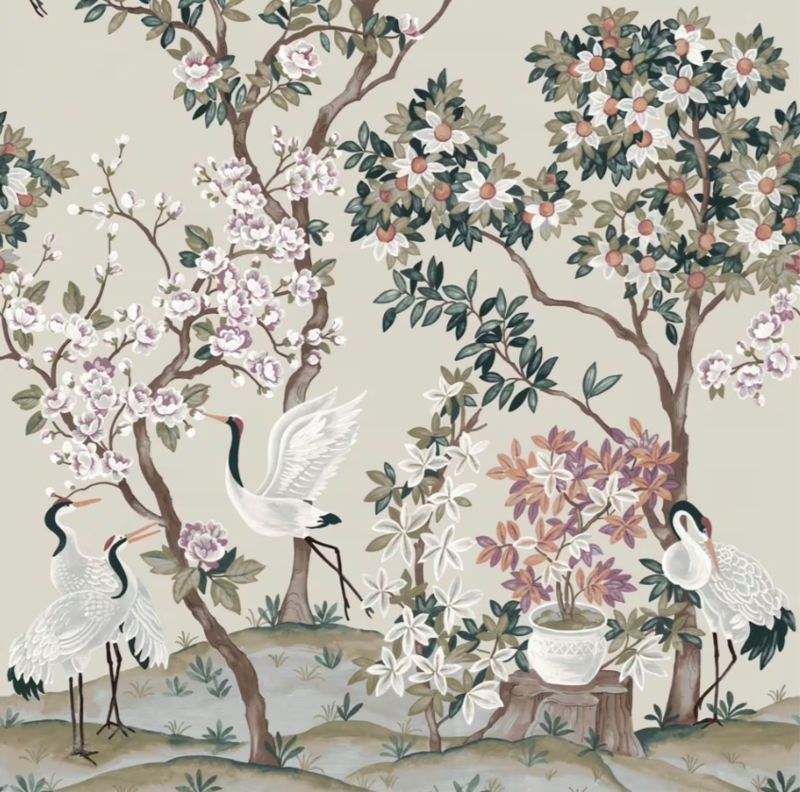 368024 Serene Garden with Cranes Beige uit de Noble Zen-collectie van Rasch is een herhaalbaar fotobehang van 159 x 280 cm met een weelderige Japanse tuin vol bloesemtakken, bloeiende bomen en witte kraanvogels op een warme beige ondergrond. Hetzelfde rijke chinoiserie-dessin als 368031, in een lichtere en warmere kleurstelling.