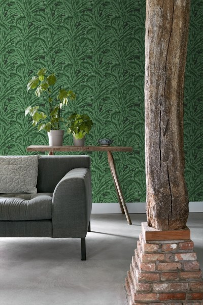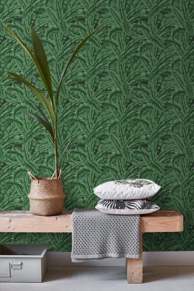 Je vindt dit behang met bananenbladeren in emerald groen (139016) in de collectie Jungle Fever.