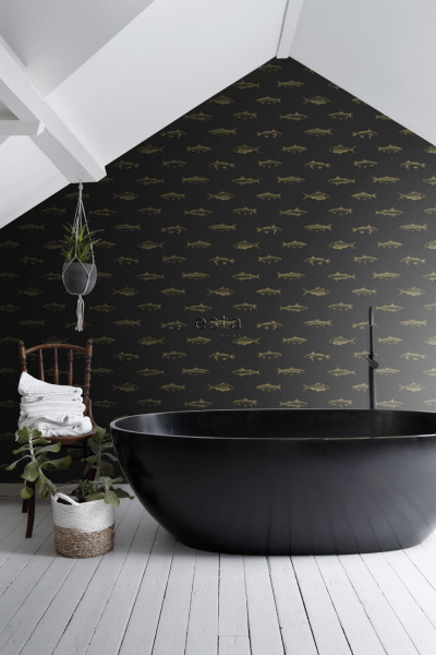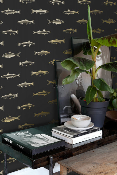Dit geweldige behang met pengetekende vissen in zwart en goud maakt van je muur een echte eye-catcher en geeft veel sfeer in huis.