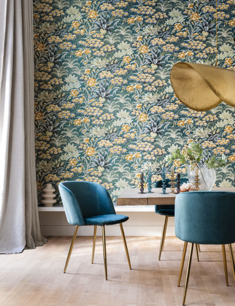 Een levende explosie van planten met de Alba roos. In een barokke stijl ontvouwen en bloeien bladeren en bloemen op het papier. De vrolijke kleuren van het einde van de zomer worden vertaald door de matte inkten.