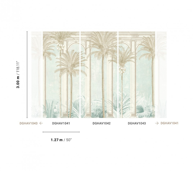 Het digitaal geprint behang Habana vat de collectie in 1 design samen: een craquelé muur met een arcade ervoor, hoge palmbomen en lagere begroeiing met tropische planten. De perfecte combinatie van architectuur en planten, beschikbaar in zachte kleuren.