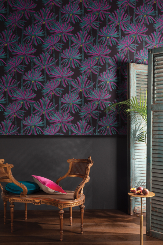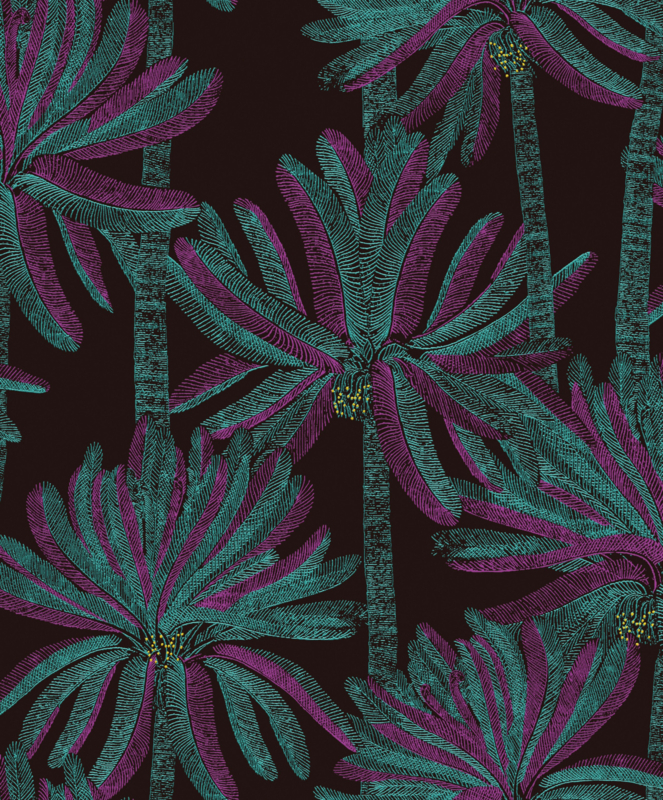 Palmary houdt zich aan de originele palmboom. Door de donkere ondergrond komt de tekening goed naar voren terwijl de felle kleuren verzacht worden.
