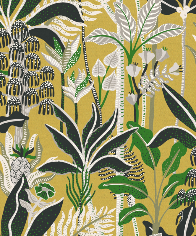 José hervormt de typische palmboom met verschillende tropische bladeren. De overdaad aan planten, puntjes en streepjes creëert een speels resultaat.