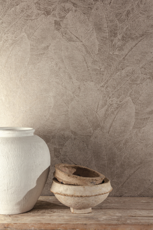 Juan gebruikt craquelé en voegt er een tropisch blad aan toe, afgewerkt met een glanzende techniek en beschikbaar in neutralere kleuren.