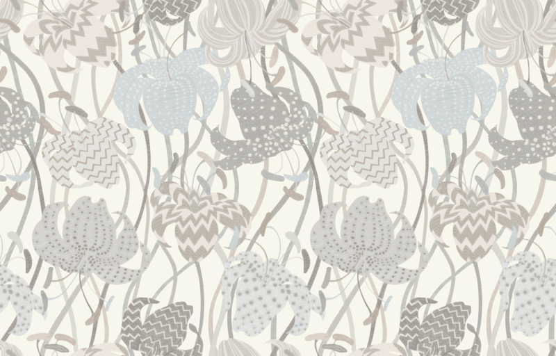 Een echt Missoni ontwerp, die de lelie op een illustratieve manier herinterpreteert: de gestileerde lijnen van de bloemen omringen klassieke decoratieve motieven met gebroken lijnen, plat aangebracht op de bloembladen,