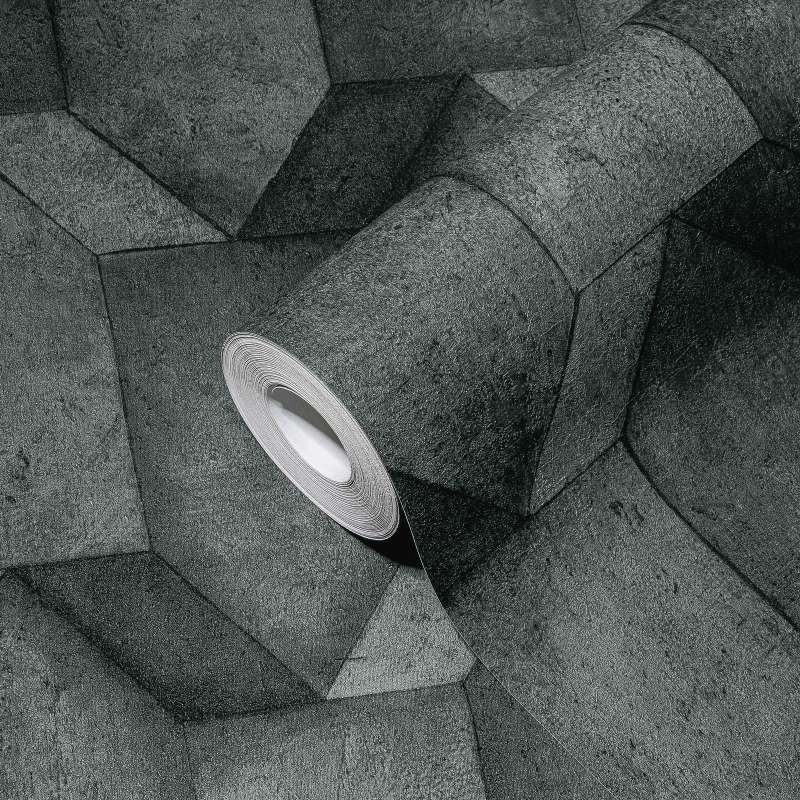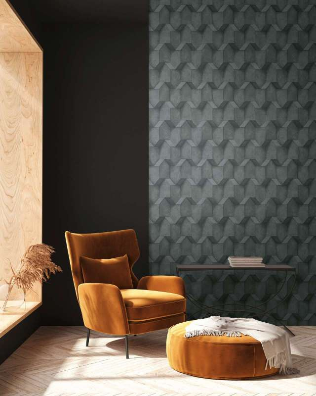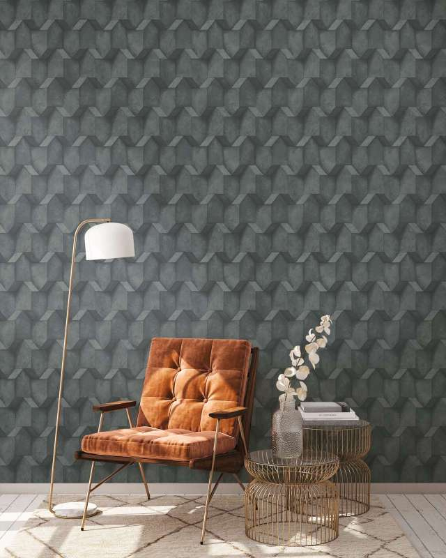 Driedimensionaal patroon en optische illusies in betonlook brengen spanning op de muren zonder overweldigend te zijn. Dit ruitvormige 3D patroon past perfect bij een minimalistische, industriële inrichtingsstijl, maar ziet er ook goed uit bij combinatie van stijlen.