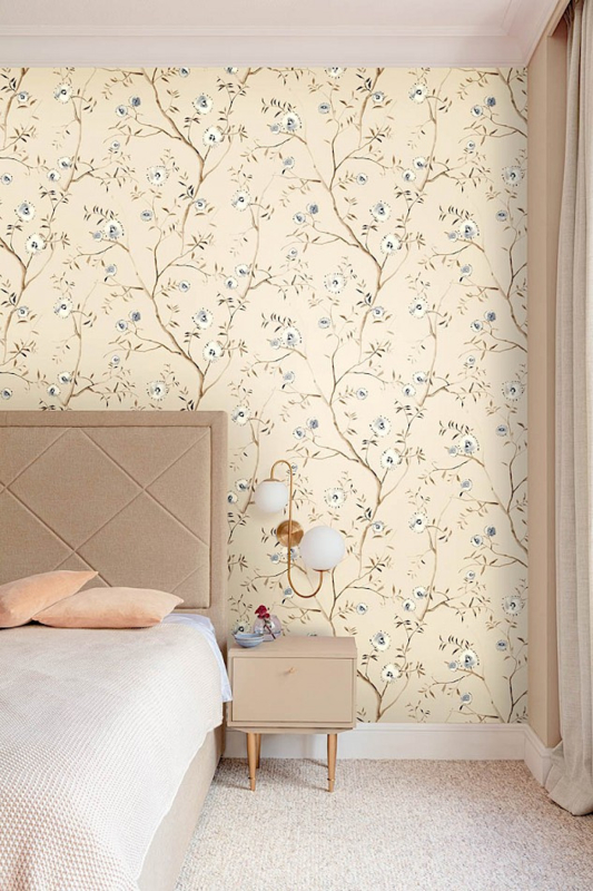 Onze wandbekleding Sari toont mooie bloesems en verwijst naar deze talloze textielontwerpen. De sari is een stuk traditionele stof, vijf tot zeven meter lang, en het bekendste vrouwelijke gewaad in India. De handgeschilderde bloesems op onze wandbekleding zijn afgewerkt met een glanzend effect op de bloemen en een vervagend effect op de bladeren en takken.