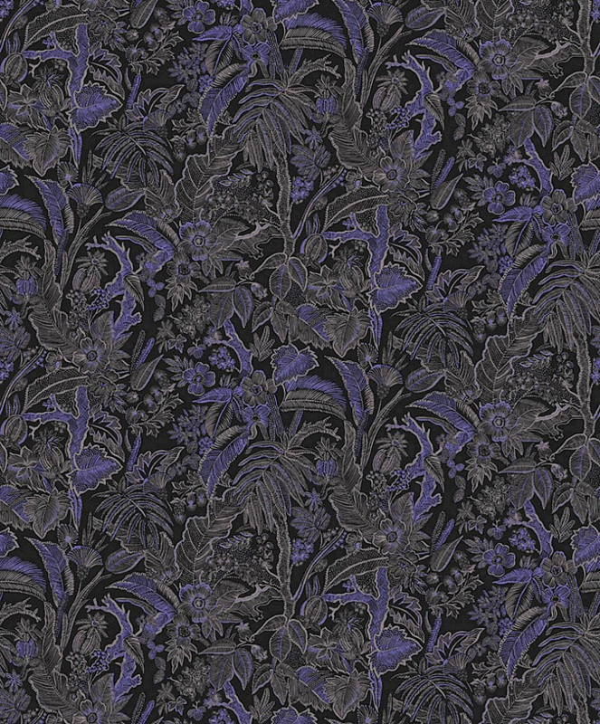 Onikar is een prachtig all-over ontwerp met een lijntekening van bladeren en bloemen. Verkrijgbaar in blauw of groen op een zwarte ondergrond, of u kunt kiezen voor de tekening in wit, op een mosterdkleurige-, zilver-, beige- of grijsblauwe ondergrond.