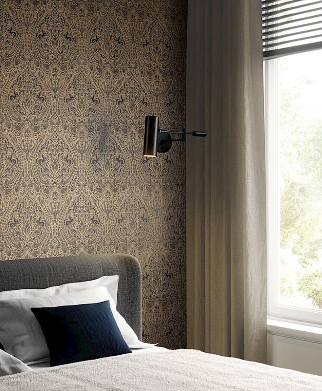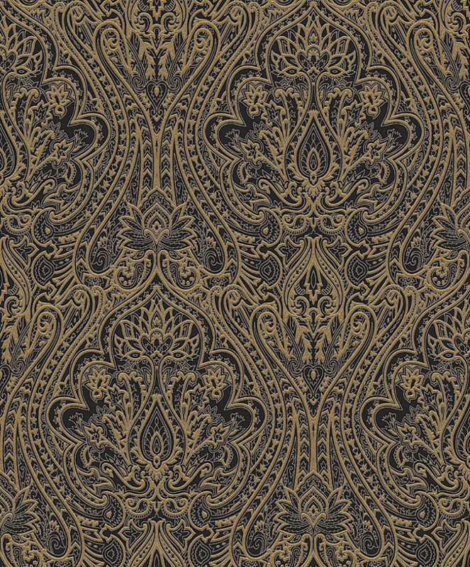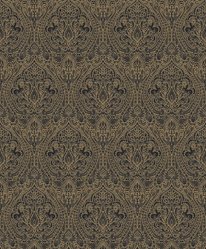 Het behang Kazamir zoekt zijn inspiratie in de Oosterse klassieke elementen. Een gestileerd patroon dat ook in kleur vereenvoudigd is, speelt met de tegenstelling van strakke, fijne lijnen en zwaardere gekleurde lijnen, afgewerkt met goud of zilver.