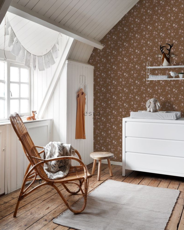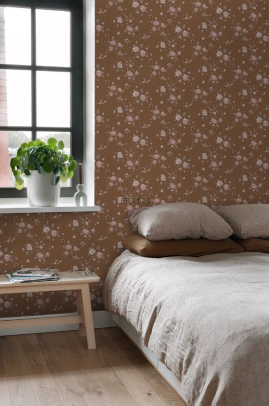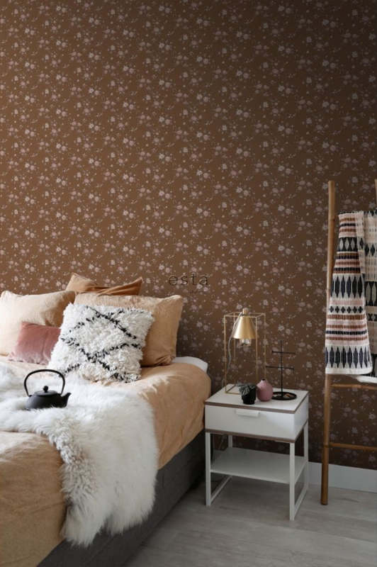 Met dit behang met bloemetjes in roest bruin en roze creëer je een warme en knusse sfeer in huis. Het behang past perfect bij een brocante, romantische stijl die een fijn nostalgisch gevoel oproept en je eindeloos laat wegdromen naar mooie momenten uit het verleden.