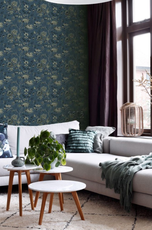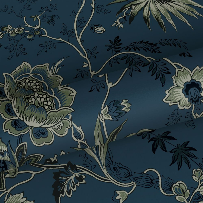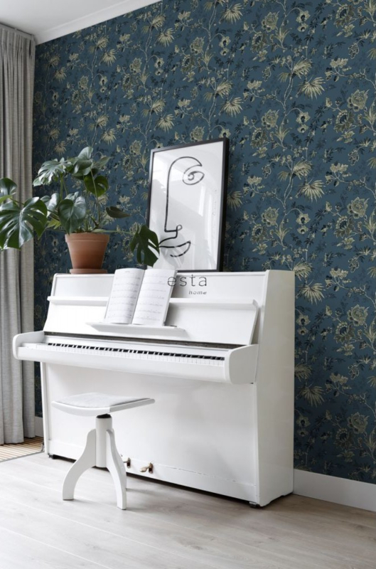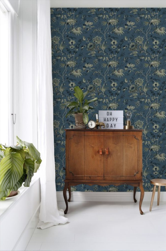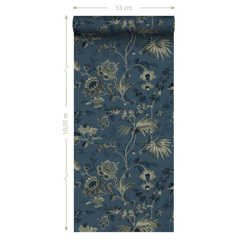 Creëer een gezellige en warme vintage look in huis met dit behang met vintage bloemen in donkerblauw en olijfgroen. Het behang roept een heerlijk nostalgisch gevoel op en met vintage accessoires en retro meubels maak je het sfeertje helemaal compleet.