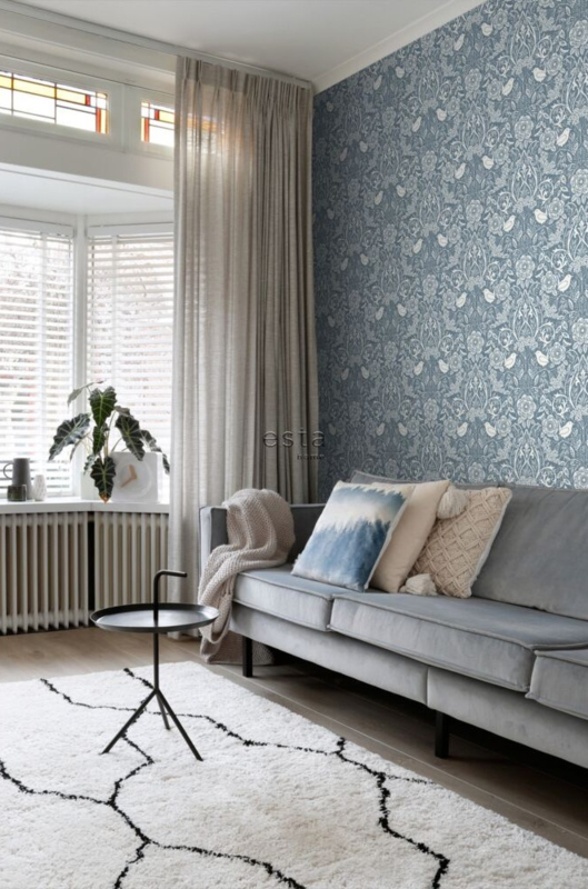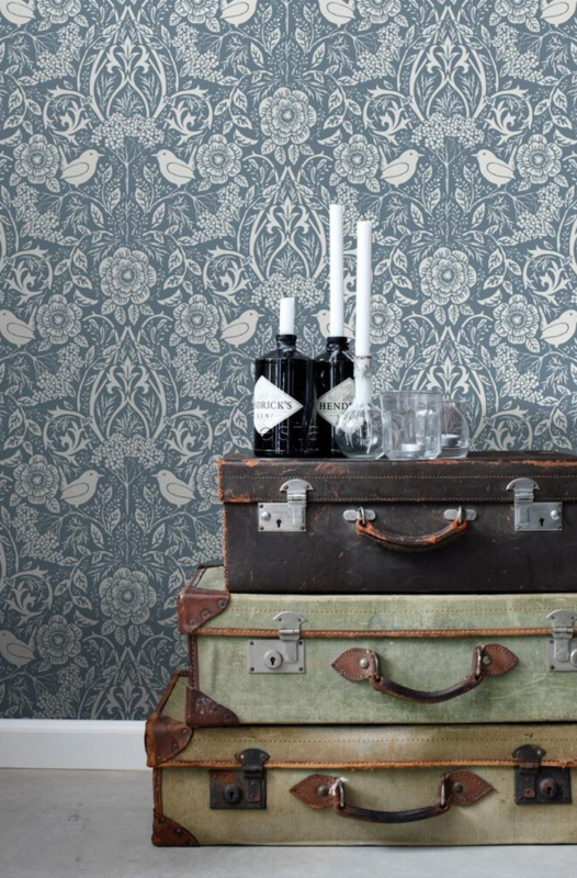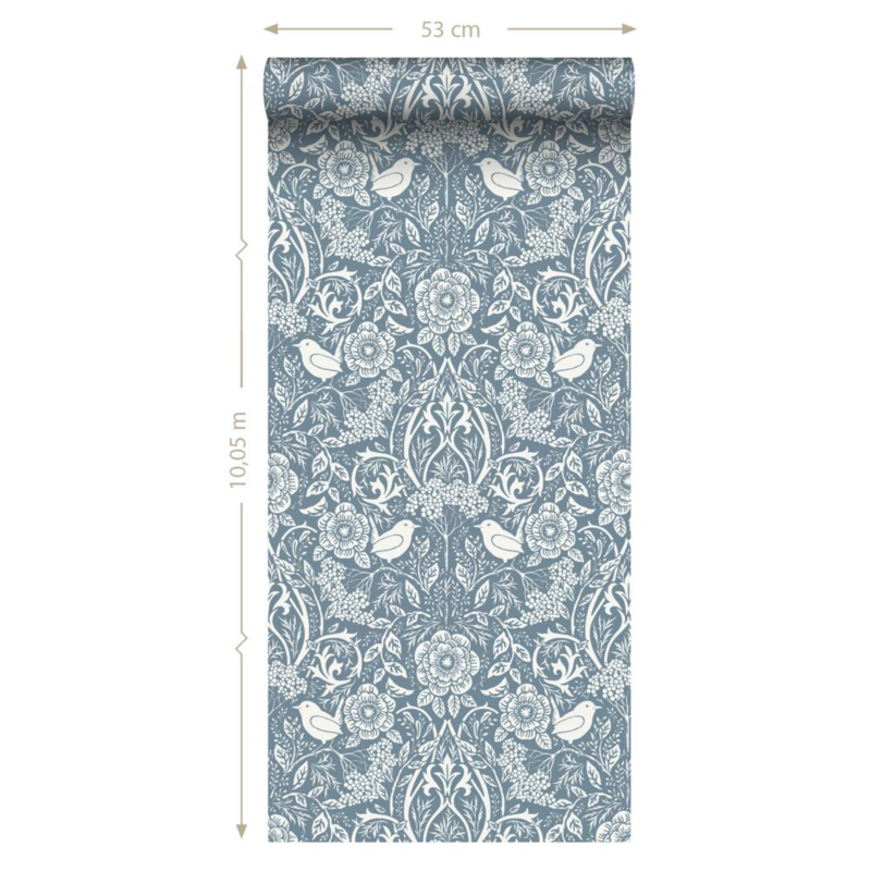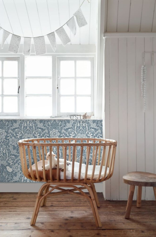 Creëer een gezellige en warme vintage look in huis met dit behang met bloemen en vogels in vergrijsd blauw. Het behang roept een heerlijk nostalgisch gevoel op en met vintage accessoires en retro meubels maak je het sfeertje helemaal compleet.