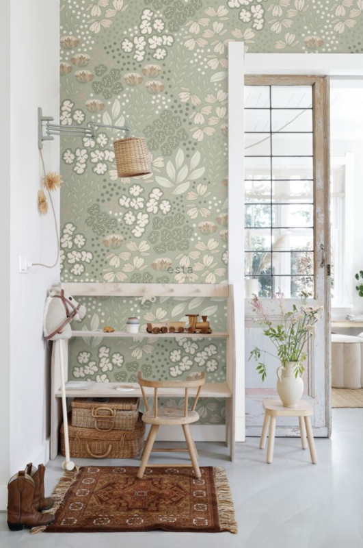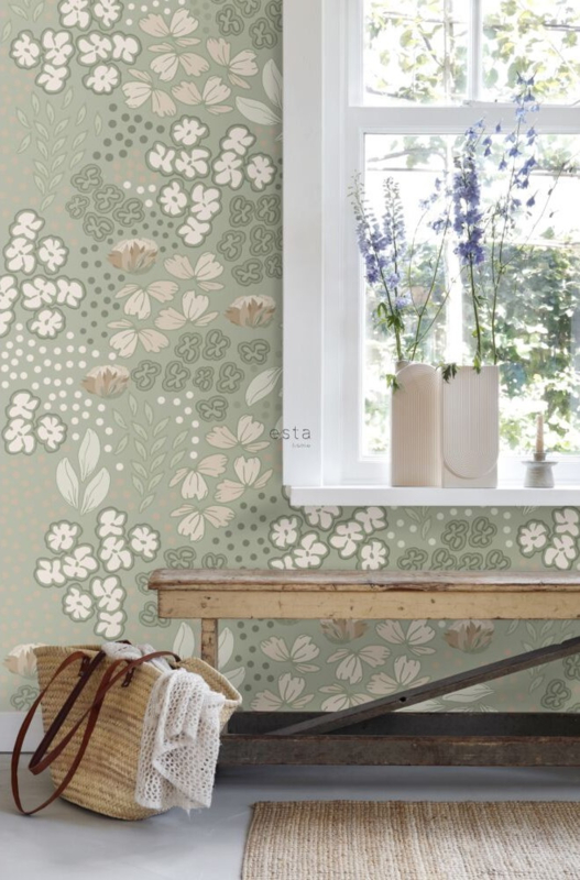 Dit trendy behang met bloemmotief in vergrijsd mintgroen vormt de perfecte basis voor een warm en sfeervol interieur. Je kunt dit behang niet alleen heel mooi combineren met lichte kleuren en materialen, maar ook met donkere, natuurlijke tinten en houtsoorten.