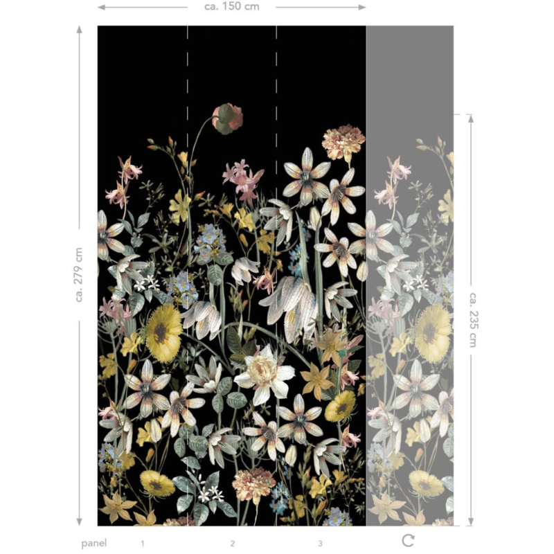De afmetingen van dit fotobehang zijn 150 x 279 cm (breedte x lengte). De print van dit fotobehang sluit links en rechts aan. Je kunt dus verscheidene fotowanden naast elkaar plakken, zodat de print doorloopt.