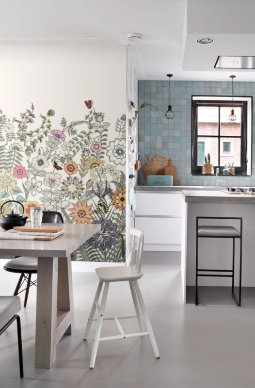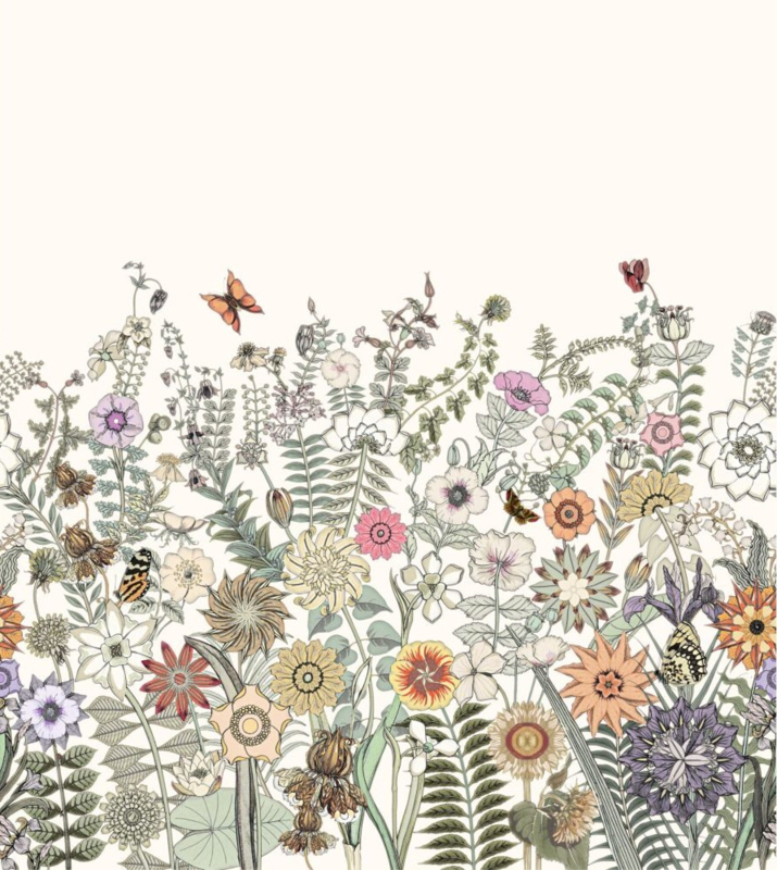 Dit hippe behang met bloemen & vlinders in groen, oranje en paars past helemaal bij de botanische look. Met dit behang haal je buiten als het ware naar binnen en maak je van je muur een echte eye-catcher. Typisch voor de botanische look zijn de lichte kleuren, de natuurlijke materialen en niet te vergeten: heel veel planten. Wil je dit behang met andere kleuren combineren? Het kleurenpalet van de botanische look is geïnspireerd op de kleuren uit de natuur. Naast frisse groentinten zoals olijf-, mint en diep heldergroen voor het ultieme botanische gevoel zie je veel vergrijsde pastels, beige- & grijstinten en zelfs intens donkere kleuren zoals zwart en bruin. Dus leef je uit, mix & match erop los en creëer thuis met dit behang je eigen urban jungle.