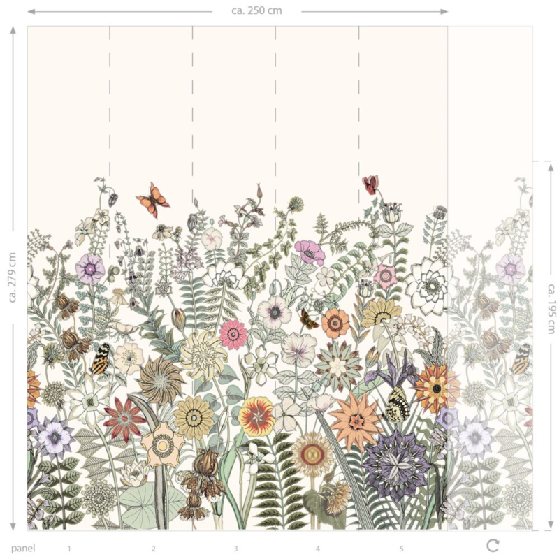De afmetingen van dit fotobehang zijn 250 x 279 cm (breedte x lengte). De print van dit fotobehang sluit links en rechts aan. Je kunt dus verscheidene fotowanden naast elkaar plakken, zodat de print doorloopt.