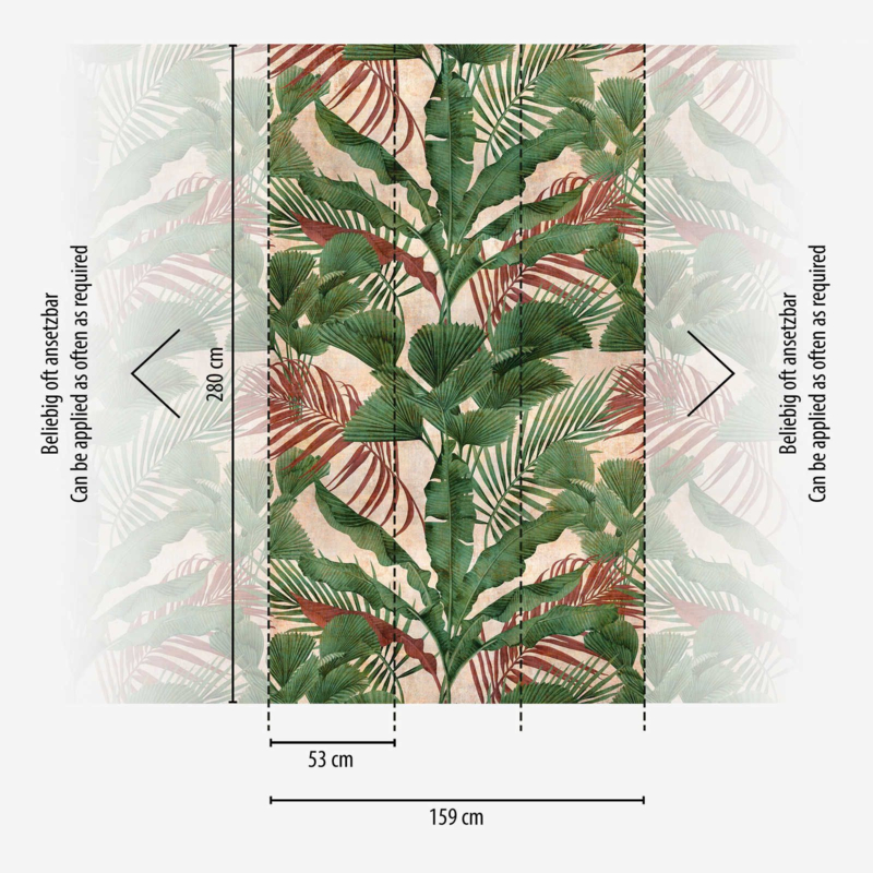 Digitaal behang met grote tropische bladeren is een prachtige en moderne manier om uw interieur een nieuwe look te geven. Het patroon, dat zich herhaalt, maakt het mogelijk verschillende rollen naast elkaar te plakken, waardoor u een continu en indrukwekkend effect creëert. De combinatie van beige en groene kleuren zorgt voor een rustige en natuurlijke sfeer in de kamer.