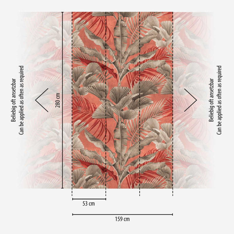 Digitaal behang met grote tropische bladeren is een moderne en opvallende manier om uw interieur een frisse look te geven. Het patroon dat zich herhaalt maakt het mogelijk om verschillende rollen naast elkaar te plakken, waardoor u een continu en indrukwekkend effect creëert. De combinatie van terra, taupe en bruin zorgt voor een warme en natuurlijke uitstraling in de kamer.